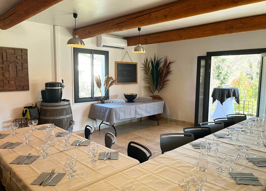 La salle est pensée pour être fonctionnelle et facile à utiliser. Elle peut être réservée seule ou intégrée à une prestation traiteur.